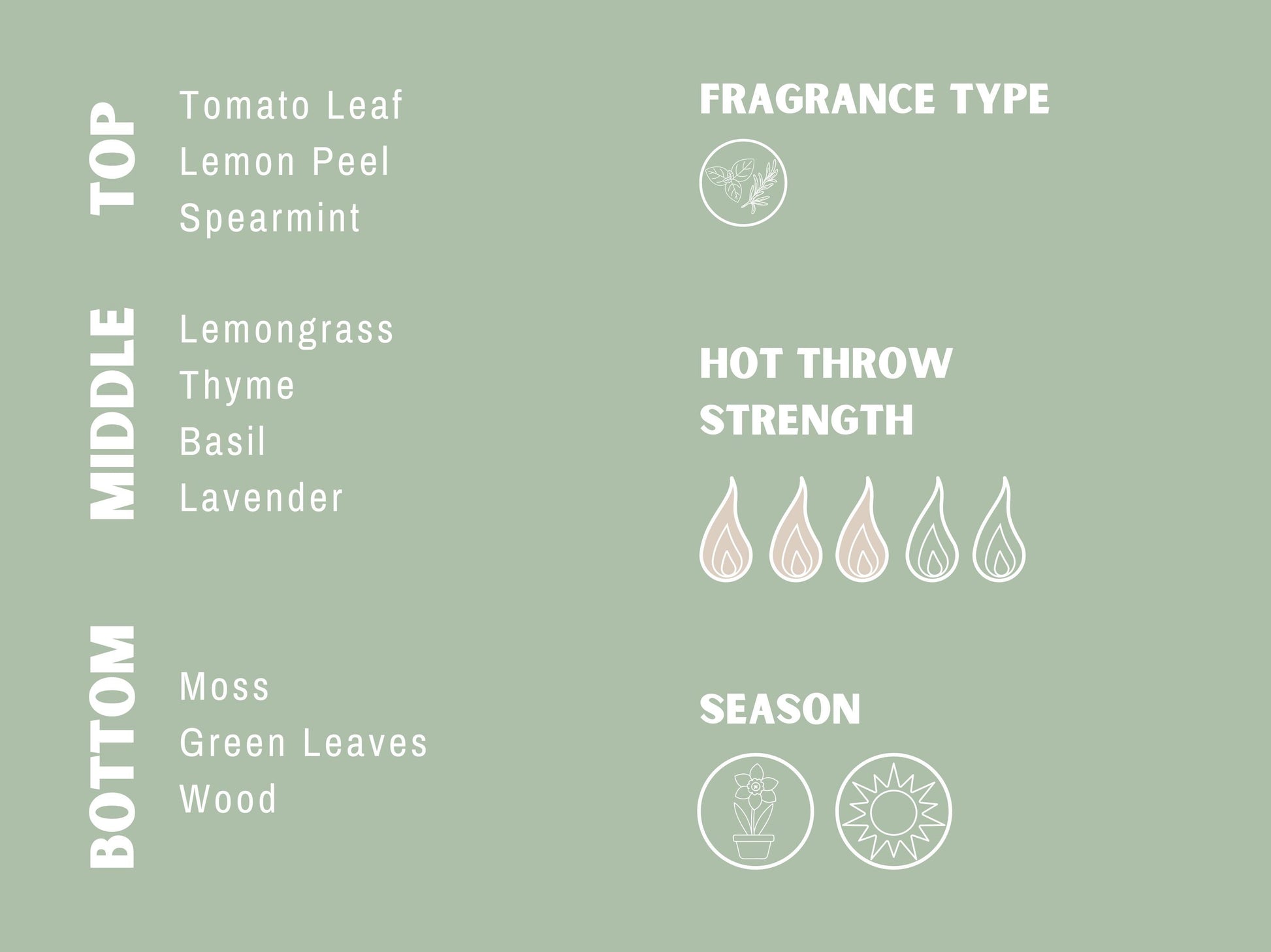 IN THE GARDEN evokes the freshness of spring with lavender, mint, and tomato leaf—reminiscent of walking through a garden and brushing against herbs and vegetables. Bright, fresh, and invigorating!